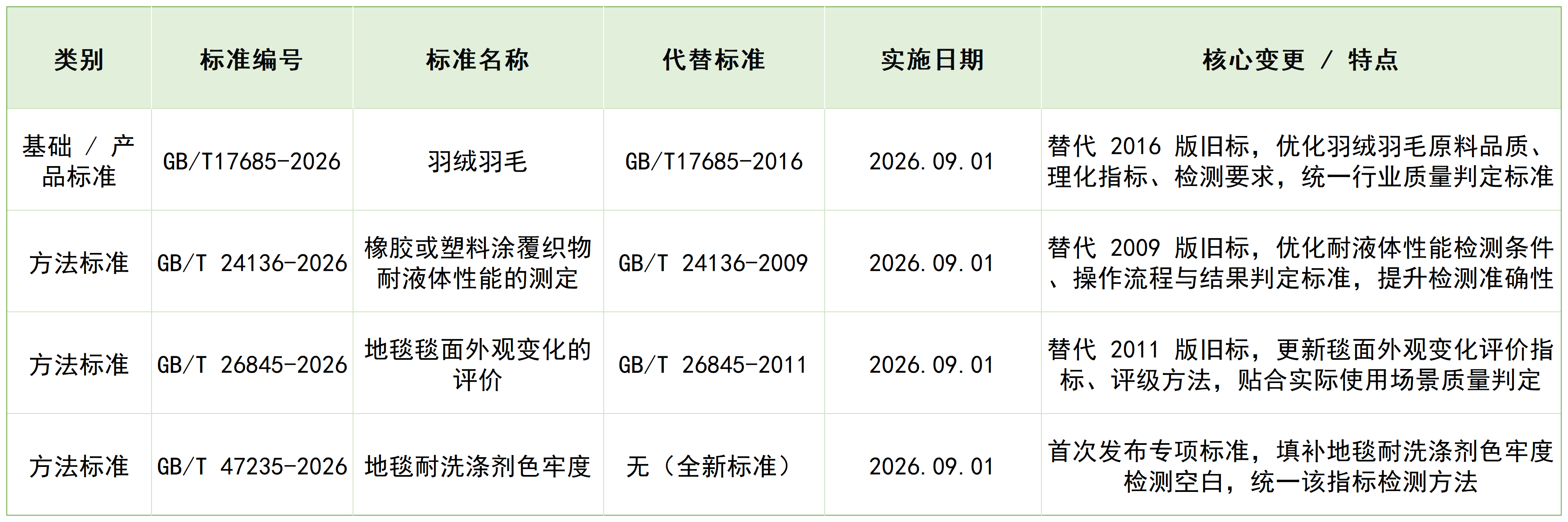 本次纺织领域 4 项国标包含1 项产品标准替代升级、2项检测方法标准替代升级、1 项检测方法标准全新发布,核心信息与变更要点如下表所示,方便企业快速对标: