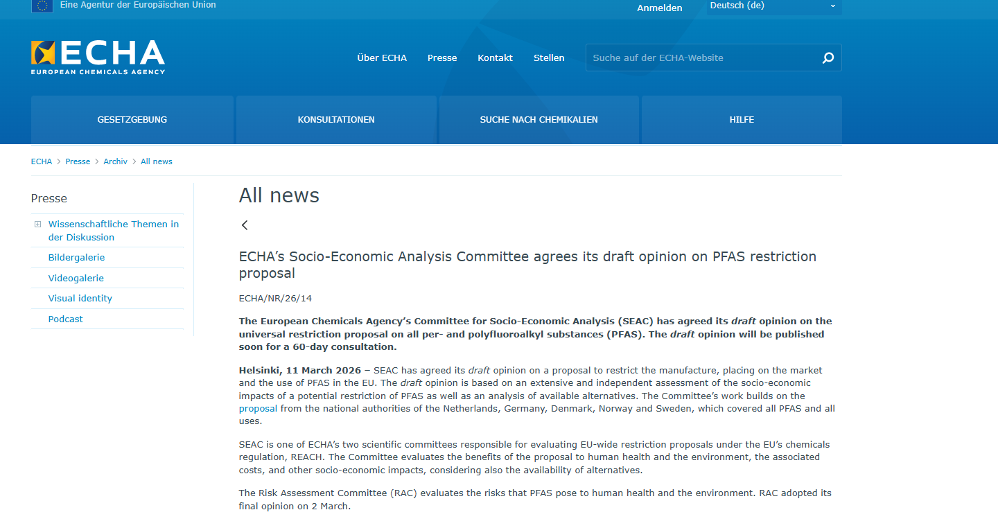 | 社会经济分析委员会(SEAC) | 评估限制措施对社会、经济的影响,包括合规成本、行业发展、替代品可用性等,出具意见草案并公开征求意见 | 2026 年 3 月 11 日达成 PFAS 限制提案的意见草案,基于独立评估分析了限制措施的社会经济影响及替代品可行性 |